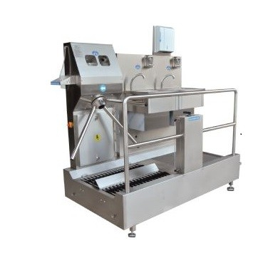 After the eye on the machine sees the person, the scrubbing system starts. The product cleans the boot's soles and around by brushing with disinfectant mixture water in horizontal and vertical direction. The product provides the first stage of hand cleaning by washing the soap taken from the liquid soap dispenser on sink. The hands are dried with the towel taken from the paper towel cabinet and the garbage is thrown into the garbage bin on the machine. The hygienic mat provides cleaning of the soles with disinfectant in it. After placing both hands on the turnstile system, the machine sprays the disinfectant to the hands and allows the machine to pass through.