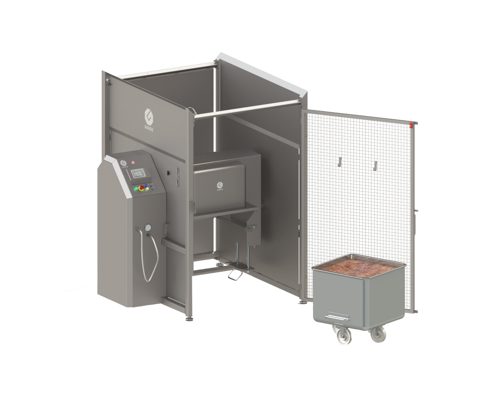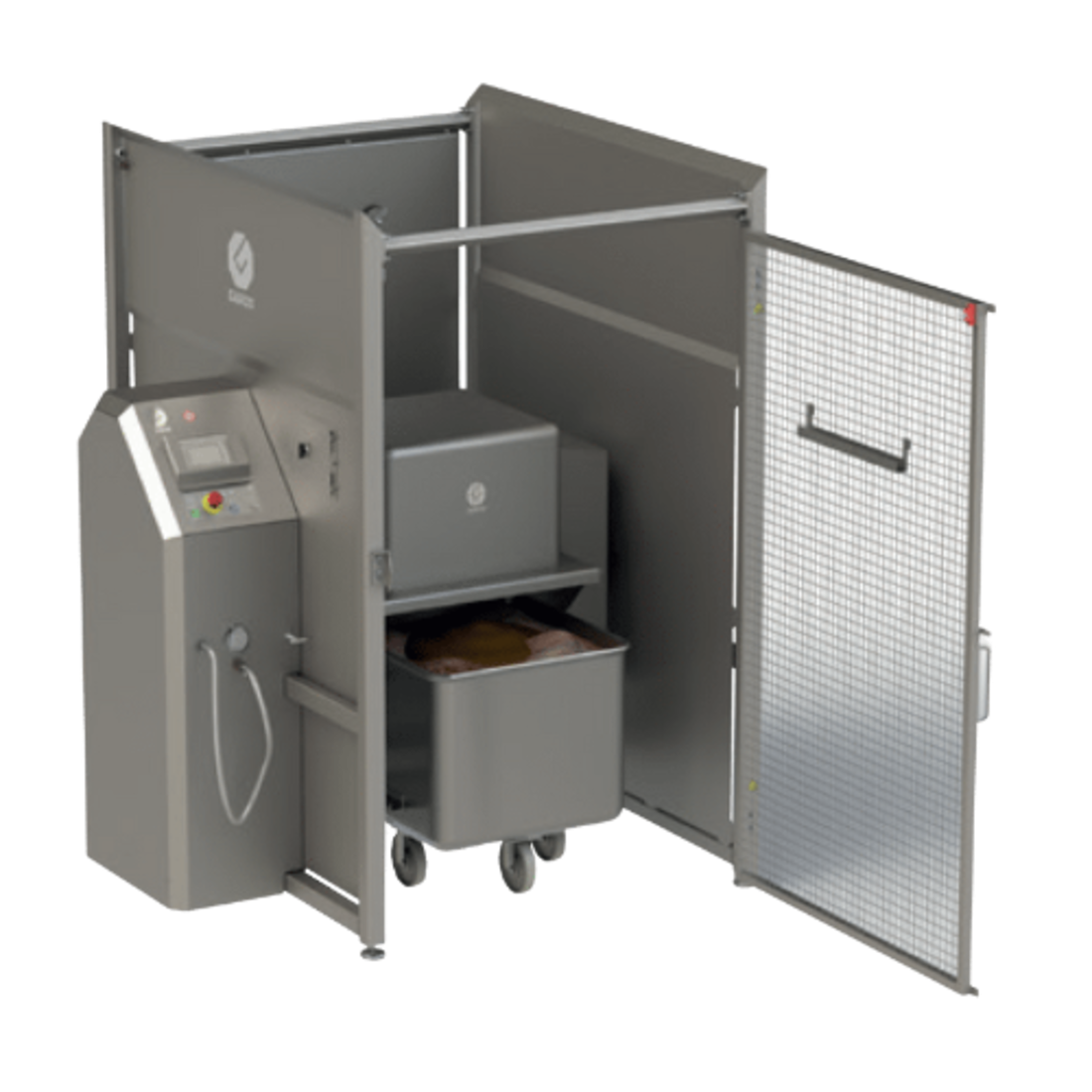 Possibilities to reach a vacuum level up to 50 percent. For higher levels of vacuum, reinforced trolleys can be used. Note that the hood above the trolley has a large volume of approximately 170 liters allowing a superior mixing transfer with each revolution coupled with the 200-litre trolley containing product. This ensures a thorough tumbling/mixing/marinating of the content and also means that the trolley can be loaded to its maximum, 200 liters per work cycle.